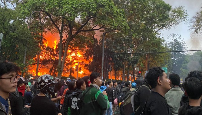 “Tadi sempat bentrok sama polisi, halaman depan parkiran Gedung Negara Grahadi tadi juga dibakar massa, pagarnya juga jebol,” ujar Irawan, pedagang minuman asal Wonocolo yang biasa berjualan di Taman Apsari Surabaya, Jumat (29/8/2025).