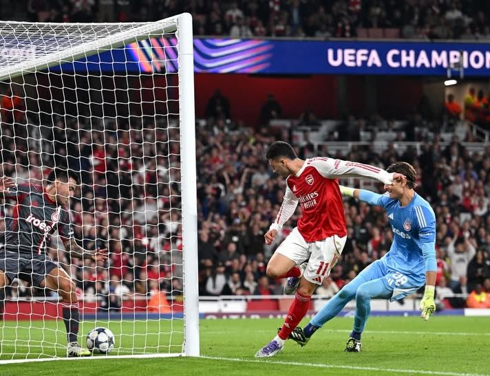 Arsenal akhirnya memastikan kemenangan di masa injury time. Bukayo Saka memanfaatkan umpan terobosan dari Martin Odegaard, dan dengan tenang menaklukkan kiper Olympiakos untuk membawa Arsenal menang 2-0.
